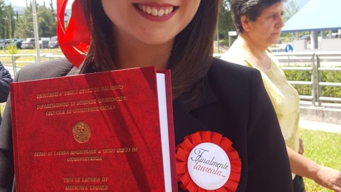 Serena Bianco Bevilacqua di Avella si è laureata in Giurisprudenza presso l’Università degli Studi di Salerno discutendo la tesi in Medicina legale dal titolo “Omicidi in famiglia: aspetti criminologici e psicopatologico forense casistica” relatore il prof. Antonello Crisci. La coordinatrice del Forum e presidente della Consulta delle associazioni ad Avella si è avvalsa per la stesura della tesi del magistrato Gianfranco Fiore che ha fornito il materiale dei 3 casi pratici di omicidi in famiglia avvenuti in Campania. Alla neo dottoressa gli auguri da parte della famiglia.