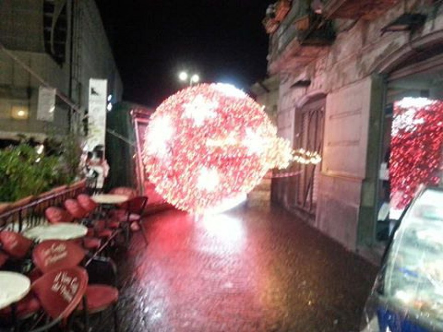 Rotola sul marciapiede la grande palla luminosa di Natale. Paura tra la gente