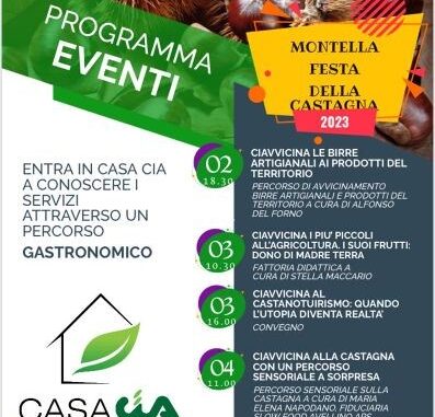 Si tiene da oggi 1° novembre 2023 fino al 5 del mese in provincia di Avellino la 39° edizione della Sagra della castagna di Montella Igp, evento di rilievo nazionale per la castanicoltura, che vede la Campania quale prima regione produttrice di castagne in Italia. E Cia Agricoltori Italiani Campania – nel quadro delle manifestazioni della Sagra di Montella – presenta l’iniziativa “Casa Cia”. Un momento di aggregazione – localizzato in via Don Giovanni Minzoni a Montella – che intende proporre il senso di accoglienza di una grande famiglia, volta a garantire att