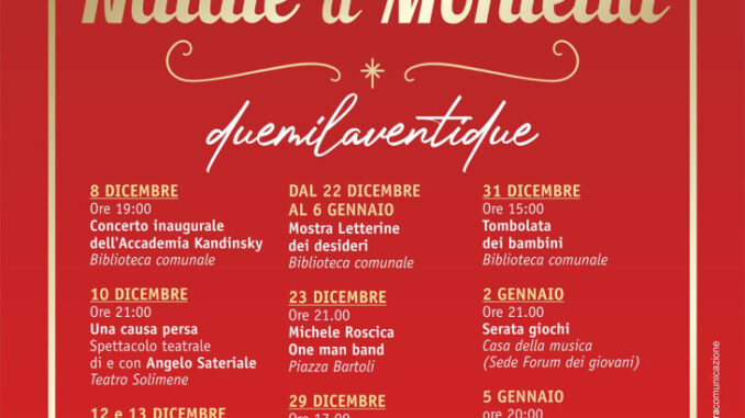 Ad aprire il cartellone di eventi è stato il Concerto inaugurale dell’Accademia Kandinsky presso la biblioteca comunale il giorno 8 dicembre. Un concerto che ha dato il via al nuovo Anno Accademico 2022/2023 con le musiche di Martina Barbone. Il 10, invece, Angelo Sateriale ha portato in scena presso il Teatro Solimene di Montella la sua commedia “Una Causa Persa”, evento inserito nel cartellone come evento conclusivo della rassegna teatrale.