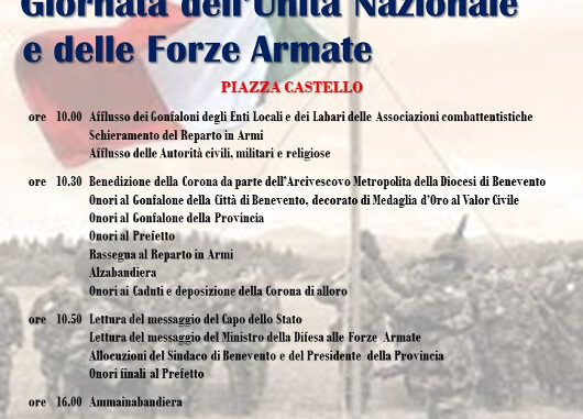 Seguiranno, poi, la lettura del messaggio del Ministro della Difesa alle Forze Armate da parte del Comandante Provinciale dei Carabinieri e le allocuzioni del Sindaco del Comune di Benevento e del Presidente della Provincia.