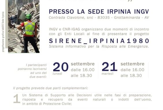 Il doppio appuntamento si terrà presso la sede “Irpinia” dell’INGV, (Istituto Nazionale di Geofisica e Vulcanologia), in contrada Ciavalone a Grottaminarda, dalle 16,00 alle 18,30, ed è dedicato in particolar modo ai Sindaci.