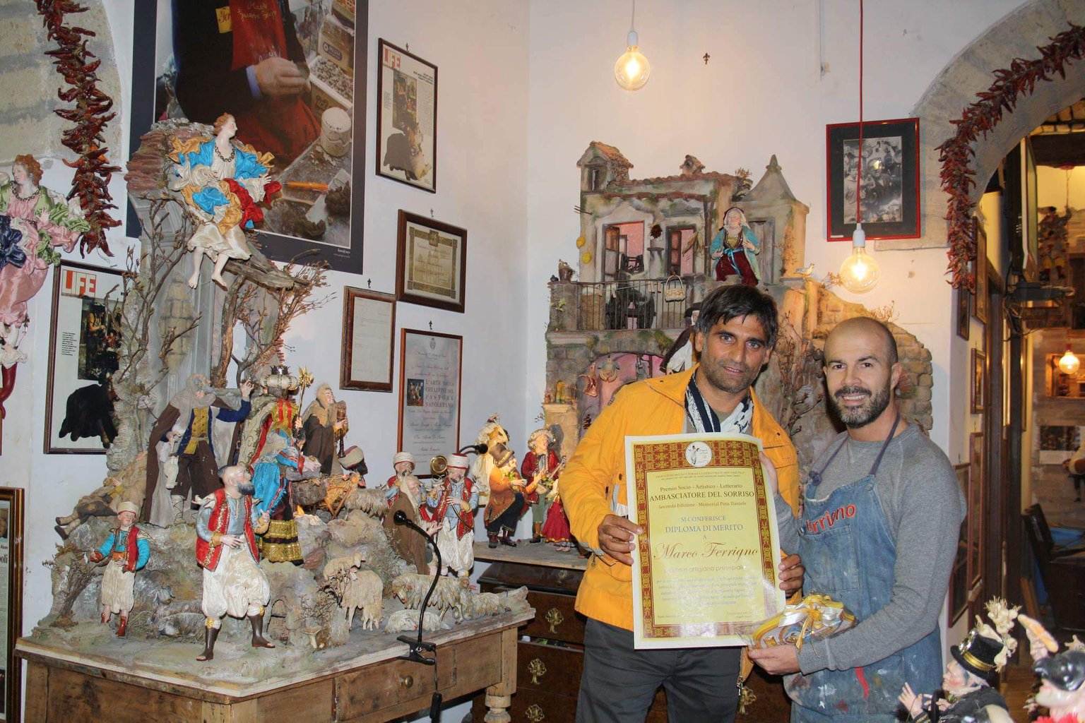 Napoli: E’ stato consegnato di recente dal fondatore del Premio Socio- Culturale “ Ambasciatore del Sorriso” l’ artista poliedrico Angelo Iannelli , nella storica bottega di Via San Gregorio Armeno ,il prestigioso Premio Internazionale “Ambasciatore del Sorriso” al maestro Marco Giuseppe Ferrigno, per le sue indiscusse qualita’ umane e professionali, per contribuire con la sua arte ad innalzare la cultura , ponendosi come esempio fulgido di arte vera e tradizione immersa nel cuore di tutti ,segnando le memorie di intere generazioni. La bottega Ferrigno Dal 1836 Arte Terracotta napoletana, restauro strutture presepiale,oltre a tramandare ai giovani la tradizione è tappa obbligatoria di vip ,attori, comici, sportivi, politici e gente comune ,che hanno ammirato e ammirano la grande bellezza napoletana della terracotta e non solo, da sempre punto di riferimento a San Gregorio Armeno ed eccellenza della Regione Campania e nota a livello mondiale.