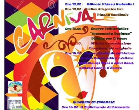 Domenica mattina dalle ore 10 si esibirà “A Mascarata Biagiana” Il gruppo folcloristico nato a Serino nella frazione di San Biagio, ha raggiunto negli anni un alto livello di popolarità, grazie alle tantissime esibizioni in molte regioni Italiane. Il gruppo formato da più di 40 personaggi, ha partecipato ai Carnevali più importanti d ‘ Italia. I protagonisti, vestiti con gli abiti tipici del folklore della Mascarata, festeggiano al ritmo di musica incalzante, lo svolgimento di un matrimonio, eseguendo le figure tradizionali della Botta e della ‘Ndrezzata. Gli ospiti del matrimonio, i belli e le belle, sono vestiti a festa e partecipano all’evento danzando al ritmo della tarantella Rossiniana, riproposizione popolare realizzata con strumenti da “strada”. Spettacolo e divertimento assicurati.