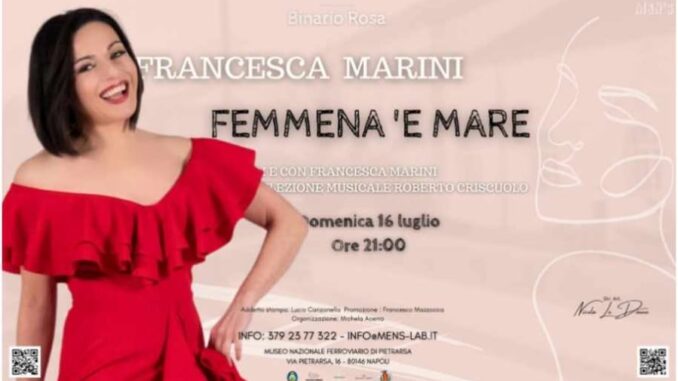 Primo appuntamento il 16 luglio, alle ore 21 con “Femmena ‘e mare”. Un “recital” della cantante e attrice Francesca Marini, che attraverso la sua voce, tra aneddoti, canzoni e poesie, omaggerà alcune delle più grandi interpreti femminili nate nelle città di mare! Brani tratti dalla canzone classica napoletana,
