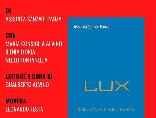 Sarà presentato sabato 4 giugno, alle ore 18.30 presso il Mondadori Bookstore di Avellino, l’ultimo lavoro di Assunta Sánzari Panza, il libro di poesie “LUX (Nova ed Vetera), Robin edizioni. Il libro contiene oltre 30 scritti con le illustrazioni di Maura Ragazzini e rappresenta per la poetessa un autentico passaggio dalla prima alla seconda stagione. Nota per le sue performance in terra Irpinia, la poesia di Assunta Sánzari Panza è assolutamente “oggettuale, materica, costantemente sul crinale tra arte quale artificio e vita marchiata a fuoco sulla carne viva. Non un verso, non una parola, non un fonema risulta estraneo al vissuto, benché sapientemente costruito, si direbbe fabbricato pietra su pietra, a partire dal lessico seletto”, come scrive il professore Gualberto Alvino nella prefazione.