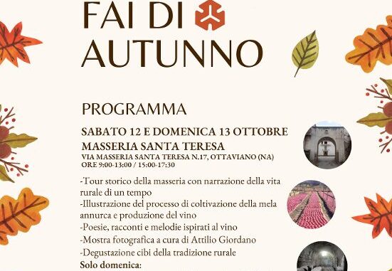 Il Gruppo FAI di Nola, in occasione delle Giornate FAI d’Autunno 2024 – uno dei più importanti e amati eventi di piazza dedicati al patrimonio culturale e paesaggistico del nostro Paese -, ha deciso di portare l’attenzione su un antica masseria e una cappella rurale del territorio agro-nolano, testimonianze preziose di un passato agricolo che ha profondamente caratterizzato l’identità della zona. Sabato 12 e domenica 13 ottobre per la prima volta, la masseria Santa Teresa di Ottaviano sarà aperte al pubblico, offrendo un’opportunità unica per riscoprire un patrimonio architettonico e culturale legato alla vita contadina e alla gestione del territorio.
