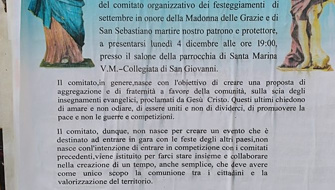 Con un manifesto pubblico affisso sulle cantonate del paese il parroco di Avella don Giuseppe Parisi invita coloro che sono interessati a fare parte del Comitato Festa patronale in onore della Madonna delle Grazie e San Sebastiano a partecipare lunedì 4 dicembre alla riunione che si terrà presso il salone della parrocchia Santa Marina – Collegiata di San Giovanni- alle 19.00.