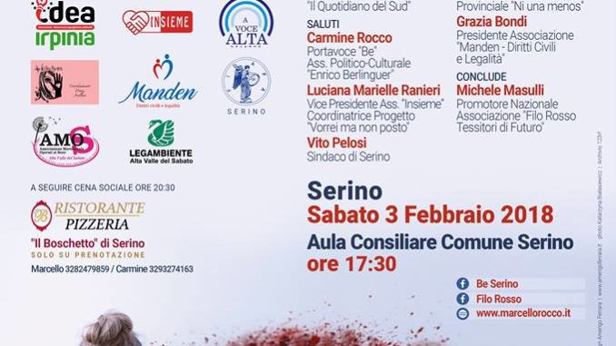 Ad introdurre il dibattito Marcello Rocco, promotore dell’Associazione “Filo Rosso” in Irpinia e Assessore al Turismo, Politiche Giovanili, Politiche Europee e PSR del Comune di Serino; a moderare l’incontro Ivana Piceiriello, Caporedattore de “Il Quotidiano del Sud”; alla quale seguiranno i saluti di Carmine Rocco, Portavoce di “Be” Associazione Politico-Culturale “E. Berlinguer”, la dott.ssa Luciana Marielle Ranieri coordinatrice Progetto “Vorrei ma non posto” e Vice Presidente dell’Associazione Insieme e Vito Pelosi, Sindaco di Serino. Gli interventi spetteranno al dottore psicoterapeuta Fabio Martino, Presidente Associazione “A Voce Alta Salerno onlus”; professoressa Annamaria Capone, Presidente Fidapa Serino; Rita Nicastro, Presidente Coordinamento provinciale “Ni una menos” e la dott.ssa Grazia Bondi, Presidente Associazione “Manden – Diritti Civili e Legalità”. Le conclusioni spetteranno a Michele Masulli, promotore nazionale dell’Associazione “Filo Rosso – Tessitori di Futuro”.