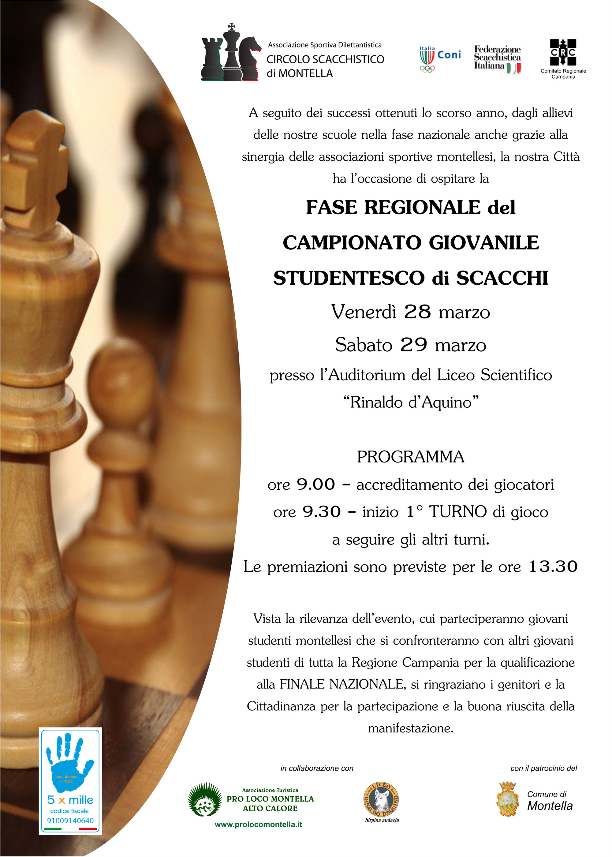 L’A.S.D. Circolo Scacchistico di Montella con la collaborazione della Pro Loco Montella Alto Calore organizza la FASE REGIONALE del CAMPIONATO GIOVANILE di SCHACCHI una occasione importante per la Città di Montella anche grazie ai risultati ottenuti lo scorso anno nelle fasi nazionali dagli scacchisti del Circolo Scacchistico. Gli Scacchi, come hanno ampiamente dimostrato numerosi studi scientifici, sono ricchi di elementi educativi, formativi e riabilitativi che favoriscono la crescita dei giovani rivelandosi particolarmente utili per risolvere situazioni di disagio scolastico, bullismo, deficit cognitivi; una occasione di spunto sull’utilità degli scacchi come strumento di educazione sociale e come strumento di educazione alla legalità nonché beneficio psicologico delle giovani generazioni.