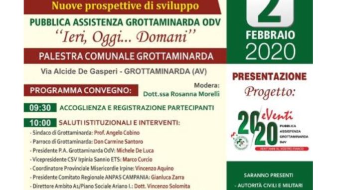 “Volontariato e territorio: Nuove prospettive di sviluppo”. É questo il tema del convegno in programma per domenica 2 febbraio alle ore 9,30 presso la Palestra comunale di Grottaminarda per celebrare i 20 anni di attività della Pubblica Assistenza Grottaminarda.