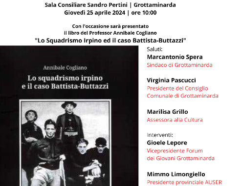 In occasione del 79° Anniversario della Liberazione l’Amministrazione comunale di Grottaminarda organizza il convegno: “Agire l’antifascismo a partire dal 25 aprile per rendere la Liberazione un nuovo inizio” con la presentazione del libro del Professor Annibale Cogliano: “Lo Squadrismo Irpino e il caso Battista-Buttazzi”.
