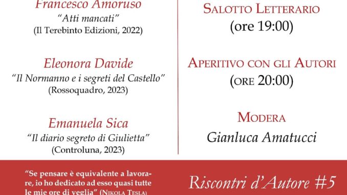 Torna il Caffe Letterario ad Avellino. Appuntamento domani 18 ottobre dalle 19.00 presso il Lupo Pub Bistrot in Corso Umberto I. Protagonisti dell’evento saranno tre autori, come di consueto. Ci parleranno dei loro libri Eleonora Davide “IL NORMANNO E I SEGRETI DEL CASTELLO”, Emanuela Sica “IL DIARIO SEGRETO DI GIULIETTA” e Francesco Amoruso “ATTI MANCATI”.