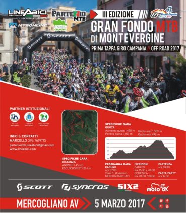 E’ conto alla rovescia per la III edizione della Granfondo MTB di Montevergine. La partenza quest’anno è fissata da Viale S. Modestino a Mercogliano. La Granfondo vale anche come prima tappa del giro della campania off-road 2017 e come prima tappa fiori dei parchi naturali 2017. Sono ammessi a partecipare tutti i tesserati FCI (esclusi Esordienti/Allievi) , Enti di promozione sportiva ACSI – AICS –ASI – CSAIN –CSEN –CSI –LIBERTAS – UISP – US ACLI, escursionisti individuali non tesserati ma muniti di certificato medico di idoneità sportiva non agonistica. Il Comitato Organizzatore ha la facoltà di non accettare iscrizioni carenti di tale certificazione. Gli escursionisti non fanno classifica e non concorrono in forma competitiva. Il percorso gara sarà suddiviso tra Granfondo (46 km) e percorso Medio/escursionistico (25 km). Per quanto il percorso di 46 km ci sarà la partenza assistita da viale San Modestino Mercogliano, dopo circa 500 mt inizia la partenza lanciata. Pendenze e fondi variabili, tratti di sottobosco, terreno battuto, pietraie e tratti semisabbiosi attraversando uno dei tratti più belli e suggestivi del Parco regionale del Partenio. Tocchiamo i comuni di Monteforte I., Mugnano Del cardinale, Quadrelle, Summonte e Mercogliano. Passando per il suggestivo borgo di Capocastello, casina del Vavaro, Campospino, Monte Cucuruzzo, Vallefredda, Abbeveratoio Campo San Giovanni, Campo di Summonte per poi raggiungere tramite un bellissimo faggeto a serpentina su fondo battuta a pendenza regolare la piana del lago di Montevergine a quota 1200 mt circa. Da qui si scende tramite un tratto in pietraia fino a quota 800 mt sulla diramazione di Campo Spino, deviando poi verso Acqua Fidia e scendendo fino a valle tramite un bel tratto tecnico. Per quanto riguarda, invece, il percorso di 26 km e 1000 mt dislivello ottimo per chi vuole farsi un giro in tutta tranquillità “assaggiando” una parte del percorso passando per il suggestivo borgo di Capocastello, Casina del Vavaro, per poi deviare verso Acqua Fidia, Single Trak fino a Capocastello.