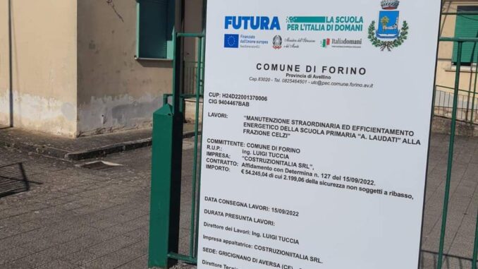 Da pochi giorni è entrato nel vivo l’intervento di efficientamento energetico e sistemazione della scuola primaria “Laudati” alla frazione Celzi. Un intervento che consentirà il rinnovamento dei servizi igienici, la sostituzione degli avvolgibili esterni, il miglioramento della coibentazione degli ambienti mediante isolamento del solaio di copertura, la sostituzione di grondaie e pluviali nonché il ripristino e la tinteggiatura di facciate e cornicioni.