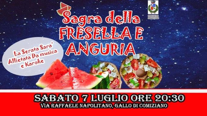 Ecco una affascinante sagra nella località di Gallo di Comiziano (NA), nel nolano, una sagra fresca e affascinante, la Sagra della Fresella e dell’Anguria organizzata dalla Proloco Gallo in via Raffaele Napolitano sabato 7 luglio a partire dalle ore 20,30. La serata sarà allietata da musica e tante altre sorprese.