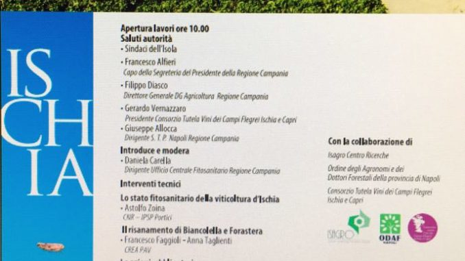 Giovedì 18 gennaio, presso la sala ex ANMI – Molo Borbonico del Comune di Forio si svolgerà un’interessante convegno dal titolo “MAL DELL’ESCA E FLAVESCENZA DORATA – Strategie di lotta ecocompatibili”.