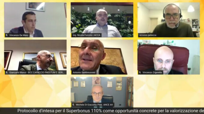 Si è tenuto nel pomeriggio a Summonte in diretta streaming, l’incontro promosso dal Comune di Summonte, dagli Ordini professionali e dal mondo della imprenditoria della provincia di Avellino per stipulare “ Un protocollo d’intesa per il Superbonus, come opportunità concrete per la valorizzazione dei borghi piu’ belli d’Italia”. Ha aperto i lavori Pasquale Giuditta, sindaco di Summonte, Comune rientrante nella lista promossa dall’Anci, tra i borghi piu’ belli d’Italia. Sono intervenuti: Erminio Petecca, presidente dell’Ordine degli architetti di Avellino, che ha ribadito l’importanza dell’impegno dei professionisti sin dalle fasi preliminari dell’accesso al Superbonus 110% per la verifica dei requisiti tecnici di partecipazione e per l’indirizzo sulle misure di finanziamento da prediligere tra il Sismabonus, per il miglioramento della sicurezza sismica, l’ Ecobonus, per la riqualificazione energetica degli edifici ed il Bonusfacciata, per il recupero delle facciate dei centri storici. E’ intervenuto Vincenzo Zigarella, presidente dell’ordine degli ingegneri di Avellino, Antonio Santosuosso, presidente del collegio dei geometri di Avellino e Nicola Furcolo, Responsabile Acca software, volto noto su YouTube per gli interessanti e seguitissimi video di “ Superbonus 110 in 33 minuti”. Hanno inoltre portato un contributo di idee all’incontro: Giancarlo Manzi, direttore generale BCC di Capaccio Paestum e Serino, Michele Di Giacomo, presidente dell’Ance di Avellino e Filippo Fasulo, manager Harley e Dikkinson, promotori del progetto “ Cappotto Mio”. Ha moderato l’evento Vincenzo De Maio, vice presidente dell’Ordine degli architetti di Avellino, esperto in materia e promotore di numerosi eventi sul tema.