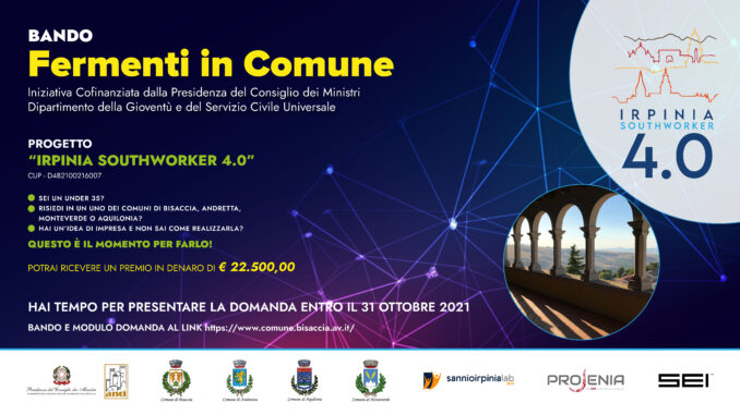 Il Comune di Bisaccia, Ente Capofila del progetto IrpiniaSouthWorker 4.0, in raggruppamento con i Comuni di Andretta, Aquilonia, Monteverde ed il partenariato economico-sociale privato rappresentato da SANNIOIRPINIA LAB APS, PROJENIA SCS e INCUBATORE SEI S.r.l., informa che è stato pubblicato sul sito istituzionale del Comune all’indirizzo https://www.comune.bisaccia.av.it/ , l’Avviso Pubblico rivolto a giovani di età compresa tra i 18-35 anni residenti in uno dei Comuni aderenti al progetto.