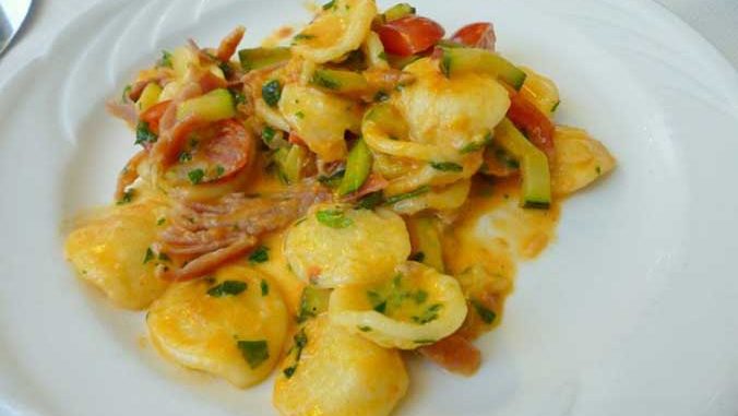 Questa è una variante a base di orecchiette pescata tra le ricette salentine più gustose. Fate soffriggere della cipolla tagliata sottilmente nell’olio ed unite poi 2 zucchine lavate e tagliate a listarelle e lo speck, circa 150 gr. Fate cuocere il tutto ed aggiungete qualche pomodorino tagliato a metà.