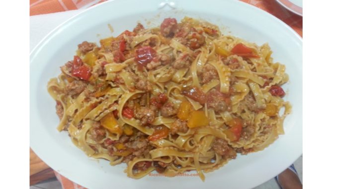 Ingredienti: 4 salsicce, 2 peperoni (1 giallo e 1 rosso o verde), 1 pelato, 1/2 kg pasta, olio extravergine di oliva Dante, 1 cipolla, vino bianco e pepe.