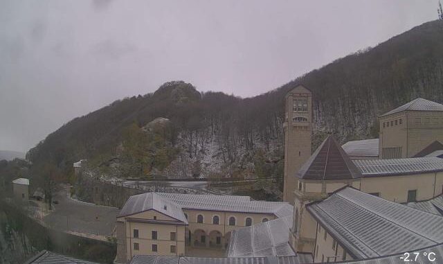 A Montevergine, nei pressi dell’abbazia, la neve ha già fatto la sua comparsa, dipingendo di bianco l’intera area e trasformando il luogo in una scena fiabesca. La sottile coltre bianca che si è formata attorno all’abbazia conferisce al panorama un’atmosfera magica e surreale, mentre gli alberi si vestono di bianco e i tetti delle case assumono un aspetto incantato.