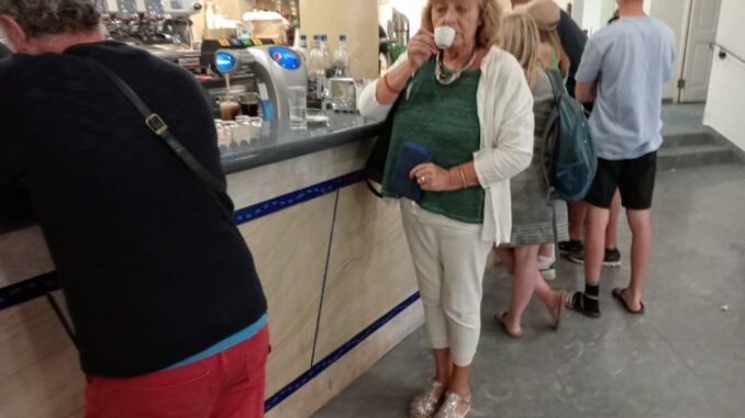 Ieri 30 agosto2023, abbiamo fotografato la Pittrice Antonietta Raduazzo al banco del bar sottostante la Piazza di Porto Cervo, e le abbiamo chiesto: