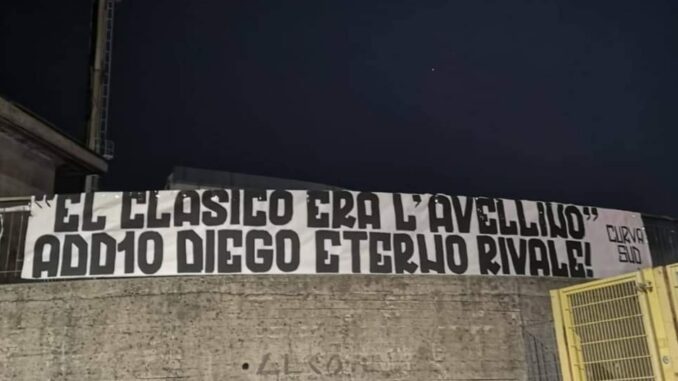 Striscione esposto all’esterno del “Partenio Lombardi”: “El Classico era l’Avellino, Add10 Diego eterno rivale!”. La Curva Sud ricorda Diego Armando Maradona protagonista nell’impianto irpino in Serie A. Quattro anni hanno visto il fuoriclasse argentino, naturalmente dal suo avvento a Napoli, misurarsi con il team biancoverde fino a che quest’ultimo ha militato nella massima categoria. Per la statistica Maradona non ha mai segnato nell’allora stadio Partenio.