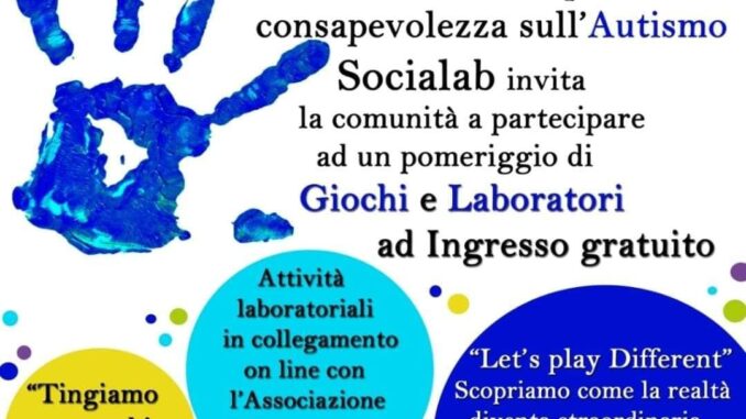 Una giornata di giochi e laboratori, in occasione della Giornata mondiale per la consapevolezza sull’Autismo: è stata organizzata da Socialab, in collaborazione con le associazioni Leo Club Irpinia e Il Fiorellino e la Tartaruga e il patrocinio del Comune di Monteforte Irpino. Si terrà il prossimo 2 aprile e coinvolgerà tutta la comunità montefortese ad un pomeriggio con giochi e laboratori ad ingresso gratuito. In particolare, si svolgeranno attività laboratoriali in collegamento online con l’associazione “Il Fiorellino e la tartaruga”, mentre il Leo Club irpino per il progetto Kairos promuoverà l’iniziativa “Let’s play different”, ovvero scopriamo come la realtà diventa straordinaria se esploriamo le nostre abilità.