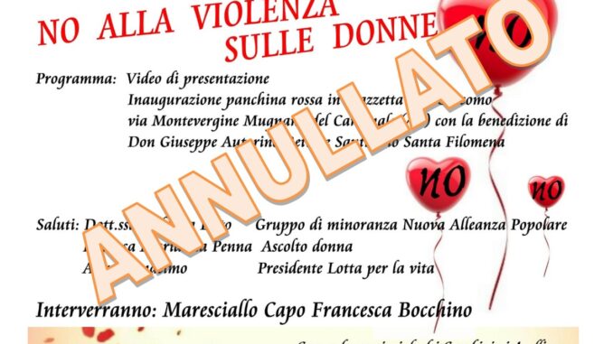 L’atteso convegno “No alla violenza sulle donne,” inizialmente previsto nel circolo “New Age” di via Garibaldi, è stato annullato a causa delle avverse condizioni meteorologiche. L’evento, che avrebbe dovuto seguire l’inaugurazione della panchina rossa in piazzetta San Giacomo, è stato rimandato a data da destinarsi.