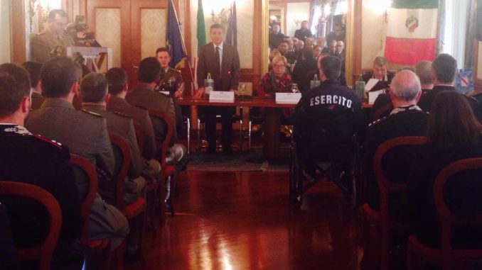 La seduta moderata dal Tenente Colonnello Antonio Grilletto ha visto il riconoscimento per l’Esercito: Sergente Pasqualino Lettieri, 1° Caporal Maggiore Vfp4 Alfonso Barbella, 1° Caporal Maggiore Vfp4 Domenico Cutolo, 1° Caporal Maggiore Vfp4 Francesco Interra, 1° Caporal Maggiore Vfp4 Francesco Testa, 1° Caporal Maggiore Vfp4 Enza Feola. Per l’Arma dei Carabinieri: Appuntato Scelto Raffaele Forte, Appuntato Scelto Raffaele Costanzo, Appuntato Carmine Savella, Appuntato Nicola Maltempo, Appuntato Scelto Saverio D’Onofrio, Appuntato Scelto Giuseppe La Salandra.