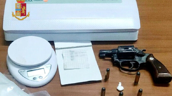 I poliziotti lo hanno raggiunto e bloccato trovandolo in possesso di una pistola a tamburo calibro 38 caricata con 5 cartucce e risultata rubata nel dicembre 2019 e un involucro contenente 0,35 grammi di cocaina.