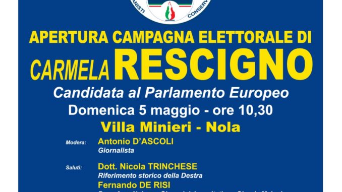 Le elezioni europee del 26 maggio sono dietro l’angolo. Pertanto, domenica 5 maggio, dalle ore 10:30 a Nola presso Villa Minieri, Guido Crosetto, coordinatore nazionale di Fratelli d’Italia, volto storico del centrodestra, aprirà la campagna elettorale di Carmela Rescigno. L’incontro, moderato dal giornalista Antonio D’ Ascoli, vedrà i saluti del dottore Nicola Trinchese, noto riferimento della destra, Fernando De Risi, presidente dell’ Area Nolana- Giovani dei comitati per Giorgia Meloni, Gennaro Ruggero, segretario provinciale di Fratelli d’ Italia, Andrea Santoro, Coordinatore Cittadino Napoli e Nello Savoia, dirigente nazionale di Fratelli d’Italia. Interverranno, inoltre, il senatore Antonio Iannone e l’onorevole Edmondo Cirielli, questore della Camera dei Deputati.