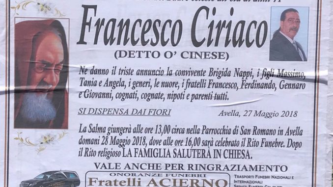 Ne danno triste annuncio la convivente Brigida Nappi, i figli Massimo, Tania e Angela, i generi, le nuore, i fratelli Francesco, Ferdinando, Gennaro e Giovanni, cognati, cognate, nipoti e parenti tutti. La salma giungerà alle ore 13 circa nella Parrocchia di San Romano in Avella domani 28 maggio 2018, dove alle ore 16 sarà celebrato il Rito Funebre. Dopo il rito religioso la famiglia saluterà in Chiesa.