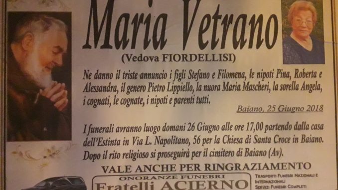 I funerali avranno luogo domani 26 giugno alle ore 17,00 partendo dalla casa dell’Estinta in Via L. NApolitano, 56 per la Chiesa di Santa Croce in Baiano. Dopo il rito religioso si proseguirà per il cimitero di Baiano.