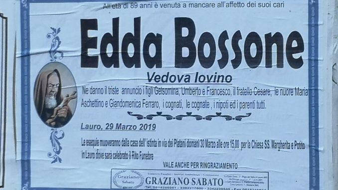Ne danno triste annuncio i figli Gelsomina, Umberto e Francesco, il fratello Cesare, le nuore Maria Aschettino e Giandomenica Ferraro, i cognati, le cognate, i nipoti ed i parenti tutti. Le esequie muoveranno dalla casa dell’Istinta in via dei Platani il 30 marzo alle ore 15 per la Chiesa SS. Margherita e Potito in Lauro dove sarà celebrato il rito funebre.