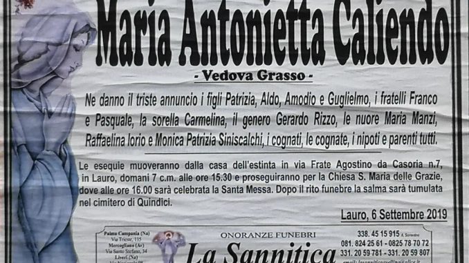 Ne danno il triste annuncio i figli Patrizia, Aldo, Amodio e Guglielmo, e fratelli Franco e Pasquale, la sorella Carmelina, il genero Gerardo Rizzo, le nuore Maria Manzi, Raffaelina Iorio e Monica Patrizia Siniscalchi, i cognati, le cognate, i nipoti e parenti tutti. Le esequie si muoveranno dalla casa dell’estinta in via Frate Agostino da Casoria n,7 in Lauro oggi 7 settembre alle ore 15,30 e proseguirano per la chiesa S. Maria delle Grazie dove alle ore 16 sarà celebrata la Santa Messa. Dopo il rito funebre la salma sarà tumulata nel cimitero di Quindici.