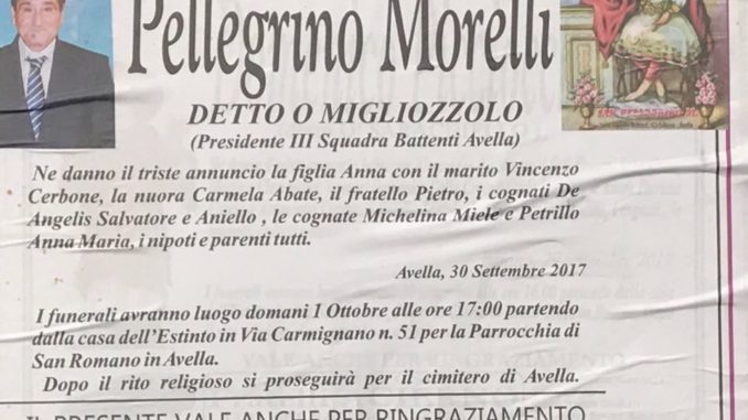 Ne danno triste annuncio la figlia Anna con il marito Vincenzo Cerbone, la nuora Carmela Abate, il fratello Pietro, i cognati De Angelis Salvatore e Aniello, le cognate Michelina Miele e Petrillo Anna Maria, i nipoti e parenti tutti. I funerali avranno luogo il 1 ottobre alle ore 17 partendo dalla casa dell’Estinto in via Carmignano 51 per la parrocchia di San Romano di Avella. Dopo il rito funebre si proseguirà per il cimitero di Avella.