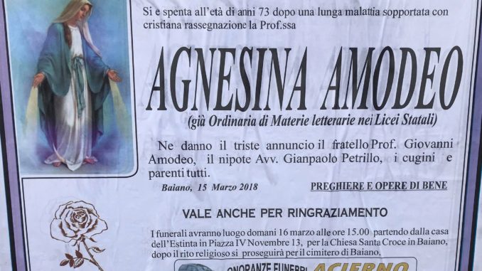 Ne danno triste annuncio il fratello Prof. Giovanni Amodeo, il nipote Avv. Gianpaolo Petrillo, i cugini e parenti tutti. I funerali avranno luogo domani venerdì 16 marzo alle ore 15 partendo dalla casa dell’Estinta in piazza IV Novembre 13, per la chiesa di Santa Croce in Baiano, dopo il rito religioso si proseguirà per il cimitero di Baiano.