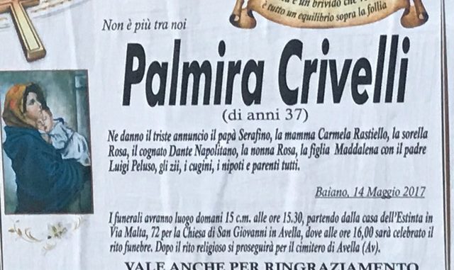 Ne danno triste annuncio il papà Serafino, la mamma Carmela Rastiello, la sorella Rosa, il cognato Dante Napolitano, la nonna Rosa, la figlia Maddalena con il padre Luigi Peluso, gli zii, i cugini, i nipoti e parenti tutti.