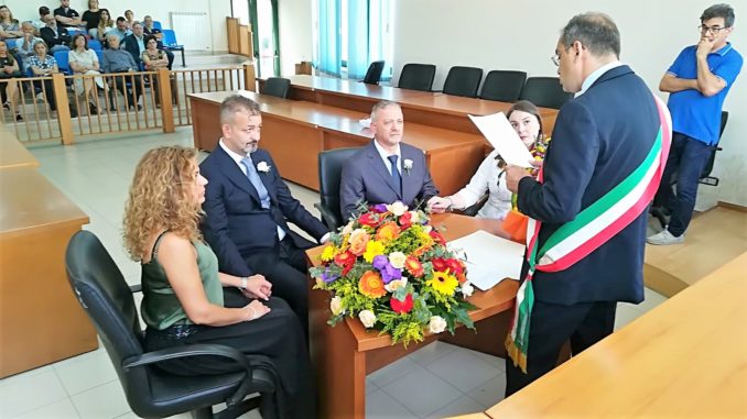 La prima Unione Civile nella storia del Comune di Brusciano avviene nell’era Montanile. Nella mattinata, il neoeletto sindaco, Giuseppe Montanile, ha celebrato la costituzione dell’Unione Civile di Giuseppe Manzo, 50 anni, e Sergio D’Onofrio, 57 anni di età, Testimoni sono state Anna Tufano e Stefania Aveta. Ad assistere il Primo Cittadino vi era il ligio funzionario comunale Vincenzo Auriemma. I due cittadini, da oggi uniti civilmente nel caloroso abbraccio di amici e parenti, sono residenti a Brusciano dal 2014, Giuseppe lavora in una ditta di fodere per sartoria e Sergio è un dipendente pubblico. Sono due anni che in Italia la “Legge Cirinnà”, la n. 76 del 20 maggio 2016, regolamenta le Unioni civili tra persone dello stesso sesso e disciplina le convivenze, dopo un lungo periodo di travagliato dibattito in Parlamento.