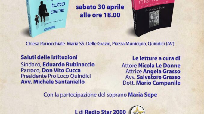 Andrà tutto bene e Il filo della memoria saranno al centro del Forum, in programma, sabato- 30 aprile,ore 18,00– nella Chiesa parrocchiale di Maria Santissima delle Grazie. Tema dell’evento, Due passi nella paura. La pandemia nei romanzi di Francesco Sepe, con gli indirizzi di saluto che saranno dati dal sindaco Eduardo Rubinaccio e dal parroco don Vito Cucca e dal presidente della Pro Loco,l’avvocato Michele Santaniello, mentre letture selezionate dai due romanzi saranno proposte dall’attore Nicola Le Donne, dall’attrice Angela Grasso, dall’avvocato Salvatore Grasso e dal dottor Mario Campanile. Punti di riflessione, saranno sviluppati dal professore Ottaviano Siniscalchi e dal professore Bruno Donnarumma, con le conclusioni dell’autore e l’intermezzo musicale classico della soprano Maria Sepe.