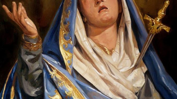 5 settembre la chiesa celebra Beata Vergine Maria all’Addolorata, trae origine dai passi del Vangelo, dove si parla della presenza di Maria Vergine sul Calvario, prese particolare consistenza a partire dalla fine dell’XI secolo e fu anticipatrice della celebrazione liturgica, istituita più tardi. Il “Liber de passione Christi et dolore et planctu Matris eius” di autore ignoto, costituisce l’inizio di una letteratura, che porta alla composizione in varie lingue del “Pianto della Vergine”. Testimonianza di questa devozione è il popolarissimo “Stabat Mater” in latino, attribuito a Jacopone da Todi; da questa devozione ebbe origine la festa dei “Sette Dolori di Maria Santissima”. Nel secolo XV si ebbero le prime celebrazioni liturgiche sulla “compassione di Maria” ai piedi della Croce, collocate nel tempo di Passione. Il 15 agosto 1233, sorse a Firenze l’Ordine dei Servi di Maria (serviti), fondato dai Santi Sette Fondatori e ispirato dalla Vergine.
