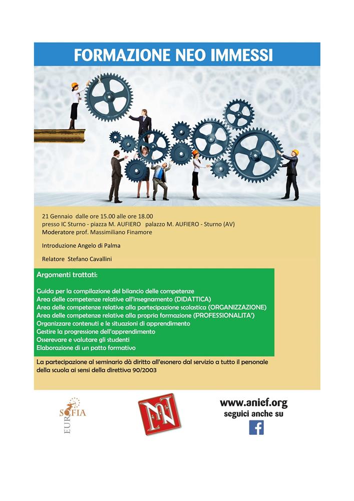 Continua il tour provinciale dell’Anief Avellino guidata dal coordinatore provinciale Prof. Angelo Di Palma, con tappa a Sturno prevista per il 21 Gennaio dalle ore 15.00 alle ore 18.00 presso l’Aula Magna di Palazzo Aufiero, sede delle Scuole Primarie dell’I.C. “G. Pascoli”. Dopo i seminari di fine anno sulla Buona Scuola organizzati con successo presso alcune scuole del capoluogo, l’Associazione sindacale che da sempre si occupa con successo del mondo della scuola con un occhio particolare per i precari, ha stilato da poco il nuovo calendario dei seminari che si terranno in provincia di Avellino. Una serie di appuntamenti importanti che consentiranno a tutti gli operatori della scuola di ottenere una buona formazione, partecipando ai vari seminari che riguarderanno soprattutto i vari aspetti della legge di riforma 107/2015. All’incontro previsto a Sturno, parteciperanno diversi docenti e dirigenti dell’Alta Irpinia oltre al Dirigente Scolastico dell’IC Statale G. Pascoli, Franco Di Cecilia, che saluterà i presenti prima dell’inizio dei lavori. L’incontro sarà moderatore dal Prof. Massimiliano Finamore giornalista e Resp. Comunicazione Prov.le Anief. L’introduzione del seminario che riguarderà prevalentemente “La Compilazione del Bilancio delle Competenze” è affidata al prof. Angelo di Palma Coordinatore provinciale dell’Anief. La materia sarà trattata con la consueta competenza dal Presidente Regionale Campania Anief Dr. Stefano Cavallini.