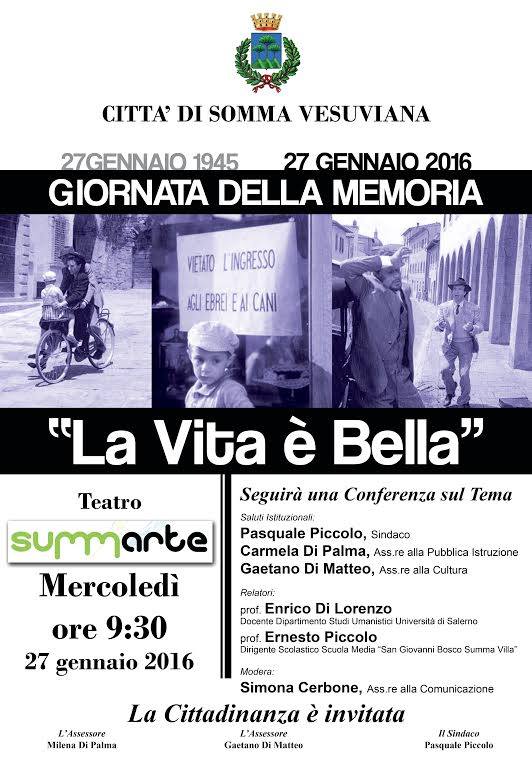 Nel Giorno della Memoria, il sindaco Pasquale Piccolo e gli assessori alla Cultura e alla Pubblica istruzione Gaetano Di Matteo e Carmela Di Palma incontreranno gli alunni delle classi terze della scuola media “San Giovanni Bosco” e gli studenti del quinto anno delle secondarie superiori di Somma Vesuviana. L’appuntamento è mercoledì 27 gennaio al teatro Summarte, dalle ore 9.30.