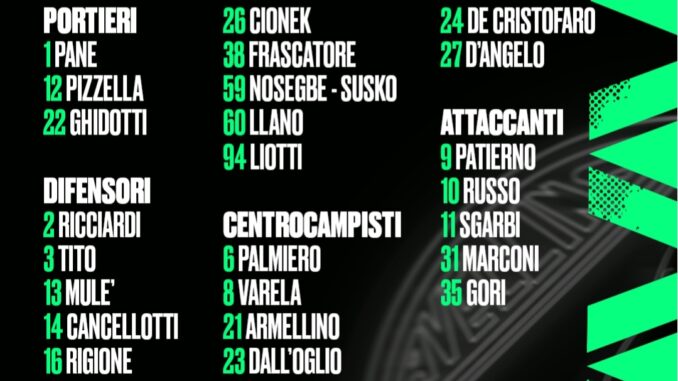 Difensori: 2 Ricciardi, 3 Tito, 13 Mulè, 14 Cancellotti, 16 Rigione, 26 Cionek, 38 Frascatore, 59 Nosegbe – Susko, 60 Llano, 94 Liotti;