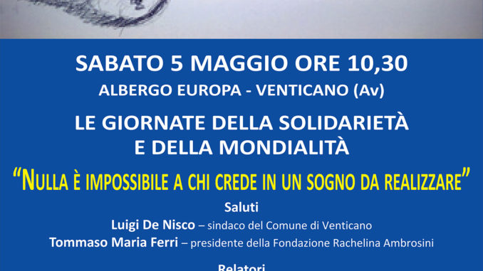 Questo l’obiettivo del Premio Internazionale “Angelo della Pace”, giunto alla diciottesima edizione e istituito dal Presidente della Fondazione “Rachelina Ambrosini”, l’avv. Tommaso Maria Ferri, la cui cerimonia sarà tenuta stamane a Venticano, alle ore 10,30, presso la sala conferenze dell’Hotel Europa, nell’ambito delle “Giornate della Solidarietà e della