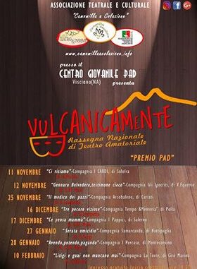 E’ con grande gioia che vi presentiamo la quarta edizione della rassegna teatrale VULCANICAMENTE, premio Pad, città di Visciano (NA). Mantenute le caratteristiche e gli obiettivi delle passate edizioni: coinvolgere compagnie di teatro amatoriale della Campania e non solo, valorizzare il territorio portando spettacoli di genere diverso, che possano incuriosire, coinvolgere e intrattenere. Promuovere la cultura attraverso il teatro , favorendo l’incontro fra esperienze sociali diverse, promuovendo la conoscenza del territorio e diffondendo, fra le nuove generazioni, l’utilizzo della vocazione artistico-teatrale quale importante mezzo espressivo. I gruppi che si esibiranno verranno da Salerno, Battipaglia, Vico Equense, Solofra, Torre di Melissa , Polla ,Cariati, Montecorvino, Paestum. Le esperienze teatrali vissute da questi rappresentano una parte importante del patrimonio sociale e culturale della nostra Campania e non solo. “Vulcanicamente” è un’occasione per favorire l’incontro fra realtà associative diverse, riflettere sulle varie forme della partecipazione sociale e sul ruolo della cultura come veicolo di partecipazione e di inclusione. Al pubblico, è offerto un ventaglio di spettacoli di qualità, dai classici di E.Scarpetta a G. Di Maio ,dai contemporanei agli autori emergenti, che si contenderanno come ogni anno il “Premio Pad” al miglior spettacolo, ma anche il premio al miglior attore/attrice e miglior regia.