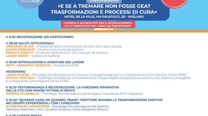 La giornata di formazione, dal titolo ‘E se a tremare non fosse Gea? Trasformazioni e processi di cura’, si terrà all’Hotel de la ville di Avellino (via Palatucci 20) sabato 23 novembre, in concomitanza con l’anniversario del terremoto dell’Irpinia del 1980.
