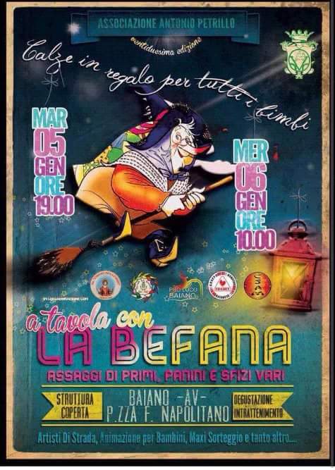 Tutto pronto ormai per la grande Festa della Befana! L’associazione Antonio Petrillo quest’anno ha dato davvero il meglio di sè organizzando un doppio appuntamento per la festa della befana! Questa sera dalle ore 19 in piazza a Baiano arriva la Befana per giocare e divertirsi con tutti dai più piccini ai più grandi e si potranno degustare buoni piatti. In caso di pioggia? Niente paura, tutto sotto il tendone! Inoltre a partire dalle ore 19 chi esporrà le proprie calze fuori dalle abitazioni, la Befana con il suo carrettino passerà per i quartieri di Baiano e le riempirà con tante tante caramelle.